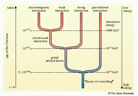 Las distintas energías de unificación y las correspondientes edades del Universo se muestran en este gráfico: