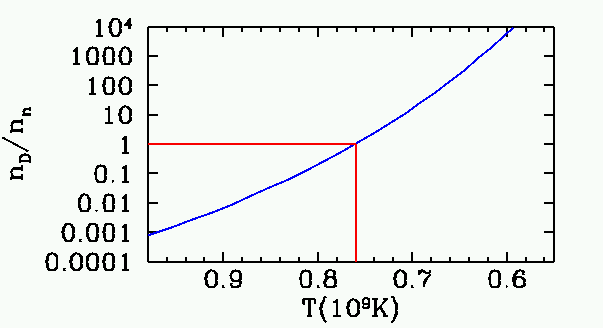 Podemos definir la temperatura Tnuc a la cual ocurre la nucleosíntesis de Deuterio como aquella a la cual nD/nn=1 (i.e. cuando la mitad de los neutrones se ha fusionado):