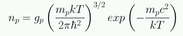 Esta ecuación se simplifica tomando en cuenta que el número de protones no cambia mucho durante la nucleosíntesis. Por ejemplo, antes de la nucleosíntesis había 5 protones por cada 6 bariones (83%) y hoy día 75% de los bariones están en forma de protones libres (Hidrógeno). Por lo tanto podemos aproximar np∼0.8nbar.