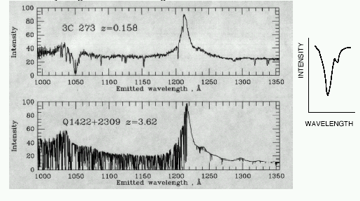 Los átomos de H producen una fuerte absorción en λ=1215.7 Å correspondiente a la transición Lyman-α (entre los estados n=1 y n=2). El D también produce esta absorción pero con un leve desplazamiento a λ=1215.4 Å debido a su mayor masa nuclear. Un espectro de cuasar muestra una fuerte absorción en 1215.7 Å causada por la alta abundancia de H, y una pequeña absorción en 1215.4 Å debido al D (ver figura anterior). Usando observaciones de muchas nubes se obtiene una abundancia media de D/H=(3.0±0.4)×10-5, lo cual se traduce en XD=(4.0±0.5)×10-5. Usando observaciones adicionales de abundancias primordiales de He y Li se deduce un valor de η=(5.5±0.5)×10-10.
