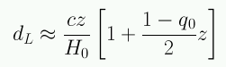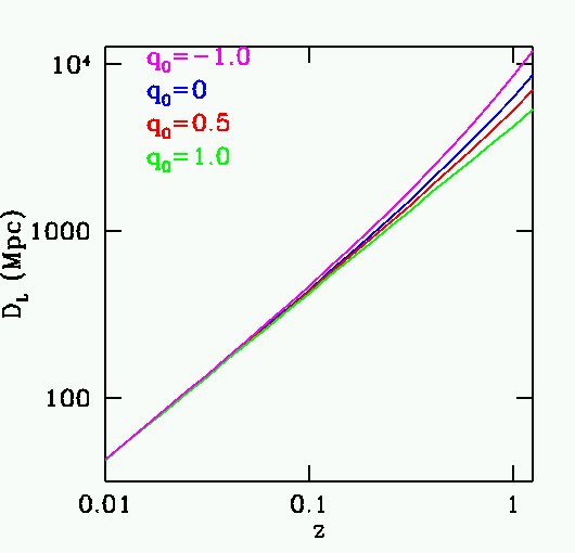 A redshifts pequeños se obtiene la habitual ley de Hubble en que dp∝z. Esta linealidad es válida para todo z sólo en el caso qo=-1. En general se espera observar una curvatura en el diagrama de Hubble a redshifts altos, la cual está determinada por qo.