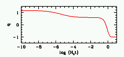 Podemos ver que si logramos medir q0 podemos determinar una combinación de parámetros εi. Los valores individuales no pueden deducirse a partir de q0. Esto es lo que se llama "degeneración". Para remover la degeneración se requieren mediciones adicionales. Usando los valores del modelo benchmark ΩΛ,0=0.7, Ωm,0=0.3 y Ωr,0≈0 obtenemos q0=-0.55. Durante la expansión el parámetro de aceleración muestra la siguiente evolución: